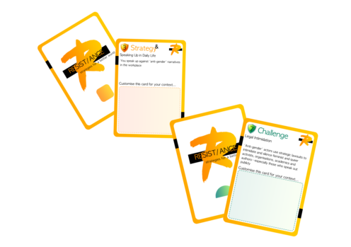 This is a game of interactive play, aimed at developing capacity together to counter ‘anti-gender’ mobilisations, or Challenges. This game helps us do this by exploring how such mobilisations operate, the real-world impacts they have, and Strategies to resist them in a space where you can reflect, learn, and act together. The goal is to create collective long-term Resilience to build better worlds.